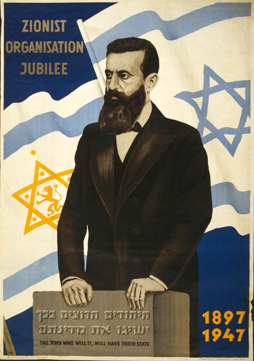 | Один из духовных лидеров евреев Европы рав Шимшон Рафаэль Гирш | Теодор Герцль на плакате к 50-летию Всемирной сионистской организации |