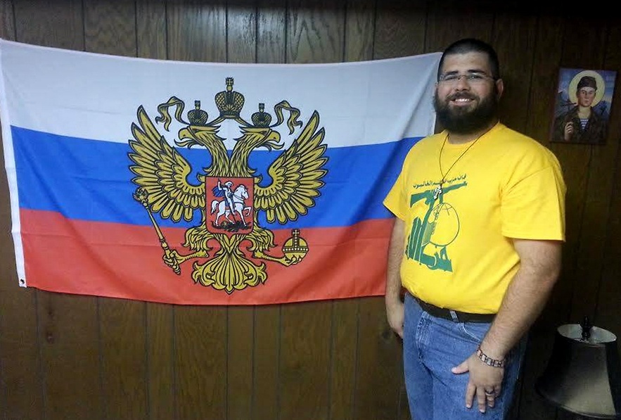 Хаймбак в футболке «Хизбаллы» на фоне флага президента России