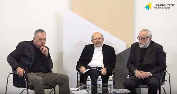 Обсуждение отчета АДЛ в Украинском кризисном медиа-центре. Слева направо: Михаил Мищенко, Владимир Паниотто, Иосиф Зисельс