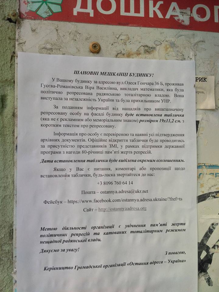Так или иначе, на сегодняшний день самая западная точка, до которой дошла «Остання адреса», — это Житомир. Иногда обращаются из небольших населенных пунктов, недавно, например, поступила заявка из села под Васильковом — адрес человека неизвестен, мы будем искать школу, откуда его увезли и, если договоримся, именно там и повесим табличку.