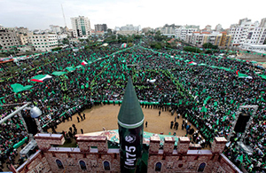 | Грандиозный митинг ХАМАСа в Газе, в центре — макет ракеты М75 |