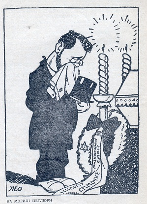 | Обложка книги Кичко и карикатура из скандального «труда». | Подпись: Жаботинский (слезно) на могиле Петлюры: «Пусть земля тебе будет пухом… из еврейских перин» |