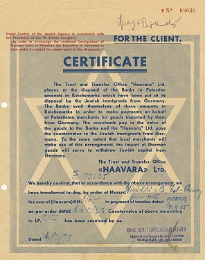 Переговоры, тем не менее, продолжаются, и 25 августа того же года сторонами подписывается соглашение, вошедшее в историю как Хаавара (Перемещение, — ивр.). В его реализации участвует компания «Ханотеа», выращивающая цитрусовые в Палестине. Эта компания, которой владел Сэм Коэн, использовала деньги (не менее 1 000 фунтов стерлингов, положенных на специальный счет в банке) эмигрантов в Палестину — средства, которые ранее были заблокированы в Германии. Средства эти предназначались для приобретения германских товаров — сельхозоборудования, строительных материалов, удобрений и т.д. Деньги при этом возвращались репатриантам в местной валюте. Таким косвенным путем капитал переводился в Эрец Исраэль, но выгоду получала и германская промышленность, сбывавшая таким образом продукцию, иногда в обход бойкота, поддерживаемого евреями в разных странах. В дополнение к этому впоследствии было заключено бартерное соглашение, по которому местные цитрусовые обменивались на германские промышленные товары. Не лишне отметить, что 1000 фунтов стерлингов — это именно та сумма, которая позволяла получить иммиграционный сертификат сверх введенных Британией квот на въезд в Палестину.