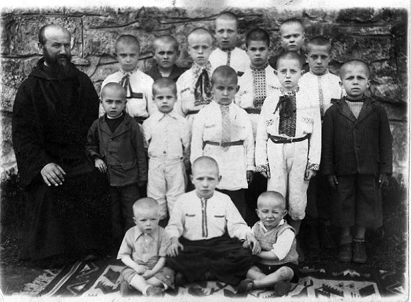 Иеромонах Даниил Тымчина с воспитанниками детского приюта, в центре в вышиванке — Адам Ротфельд