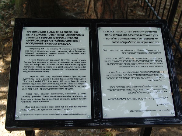 Эта история началась три года назад — с публикации старшеклассницы Александры Саржинской «Еврейская кровь. Деникинцы vs нацисты» (см. «Хадашот», №10, 2015). Девушка, занимавшаяся в историческом клубе, писала, что памятник жертвам Холокоста в ее родной Боярке  на самом деле установлен на месте совсем другой трагедии. 3 сентября 1919-го по городку, который Шолом-Алейхем называл Бойберик, прокатился деникинский погром, жертвами которого стали более 60 евреев. Среди расстрелянных был и родной дядя еврейского классика Мотл Рабинович, к которому писатель часто приезжал из Киева.