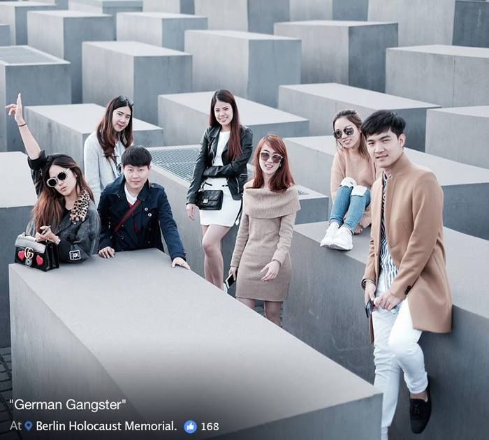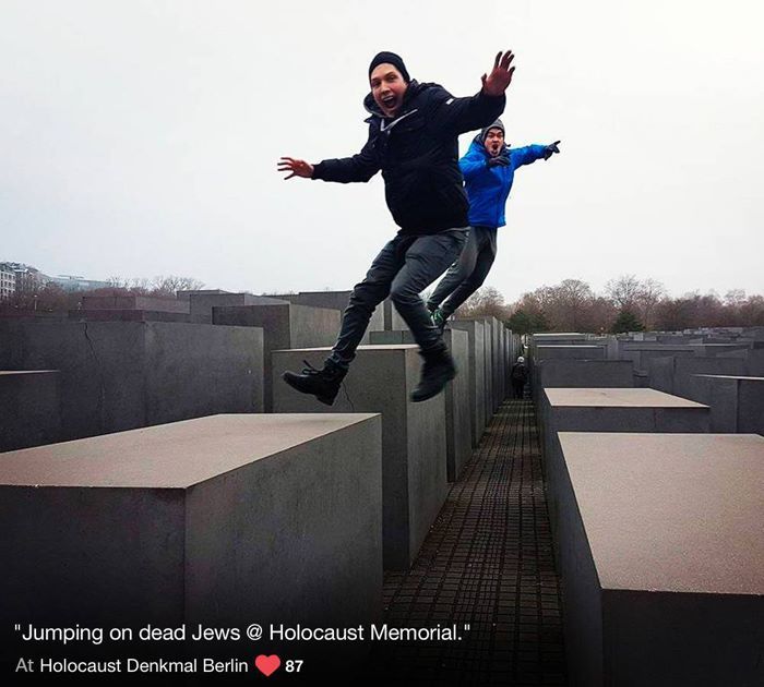 Мемориал жертвам Холокоста в Берлине со дня своего основания в 2005 году стал одной из визитных карточек столицы Германии. Ежедневно его посещают 10 000 человек, но популярность, превратившая место памяти в модный туристический объект, сыграла с ним злую шутку. Социальные сети заполнены тысячами «забавных» селфи, сделанных на серых (цвета пепла из крематориев) плитах, символизирующих несуществующие могилы евреев, уничтоженных в Катастрофе. Многие здесь не просто позируют для удачного кадра, а катаются на скейтах или велосипедах, танцуют, целуются и даже занимаются йогой. На этом фоне «органично» смотрятся комментарии вроде: «Какое замечательное место!» или «Прыжки по мертвым евреям».