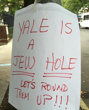 | Эмблема Йельского университета | На плакате: «Йель полон евреев. Устроим им облаву!!!» |