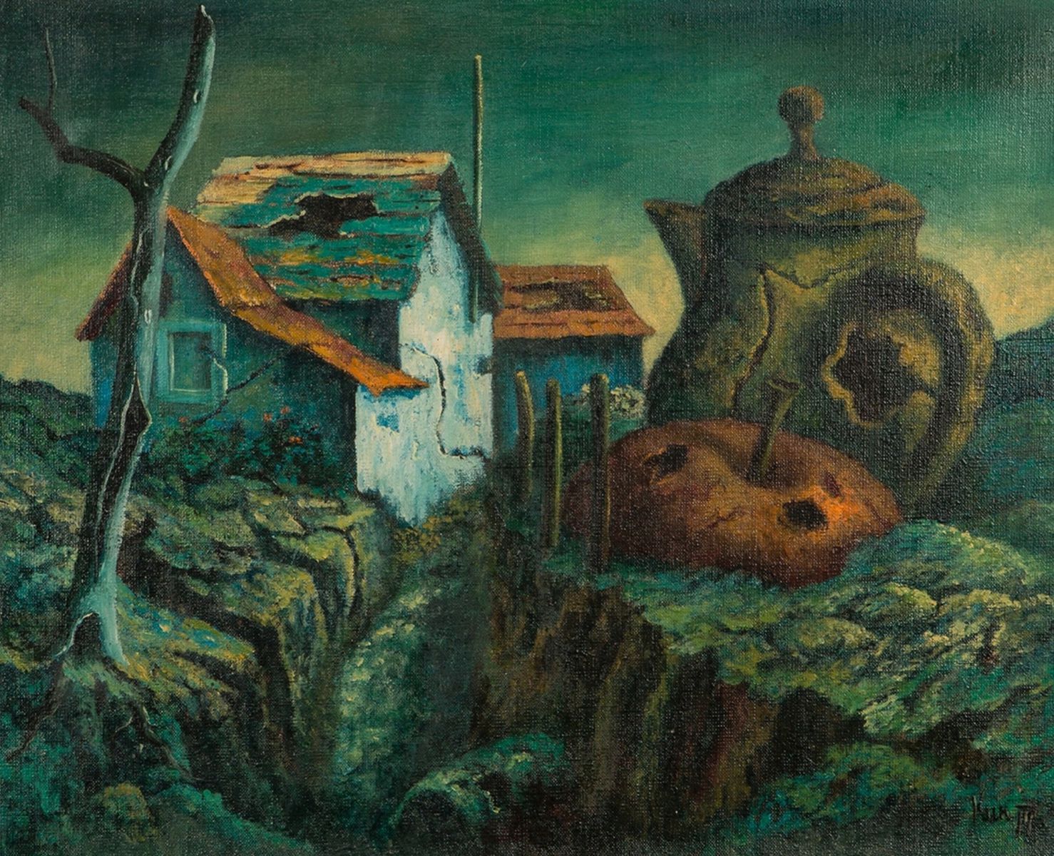 На картине «Ночной сюрреалистический пейзаж» зритель видит старый заброшенный дом с белыми каменными стенами и  проломленной — будто в нее попала бомба — черепичной крышей. Перед домом в заброшенном и никому уже не нужном саду растет огромное яблоко, вросшее от времени в сырую землю, рядом с ним стоит огромный зеленый чайник с дырой, напоминающей рану от снаряда, а внизу едва журчит почти высохший  ручеек, над которым склоняется мертвенно белое, безжизненное дерево. А над всем этим звенит молчаливое, холодное, не греющее небо, поднимающееся ледяной зеленью от тревожной дымки над горизонтом.