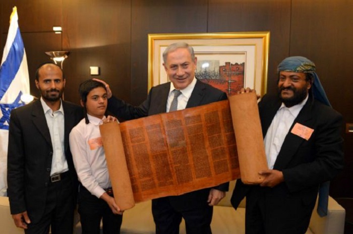 Премьер-министр Израиля Нетаниягу с йеменскими евреями и вывезенным ими старинным свитком Торы, 2016