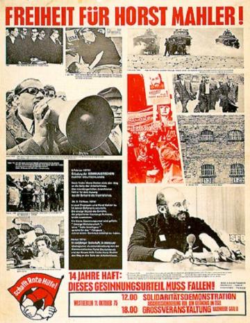 | Хорст Малер в тюремной камере, 1978 год. Кадр из фильма «Германия осенью» | Листовка с требованием освобождения Хорста Малера |