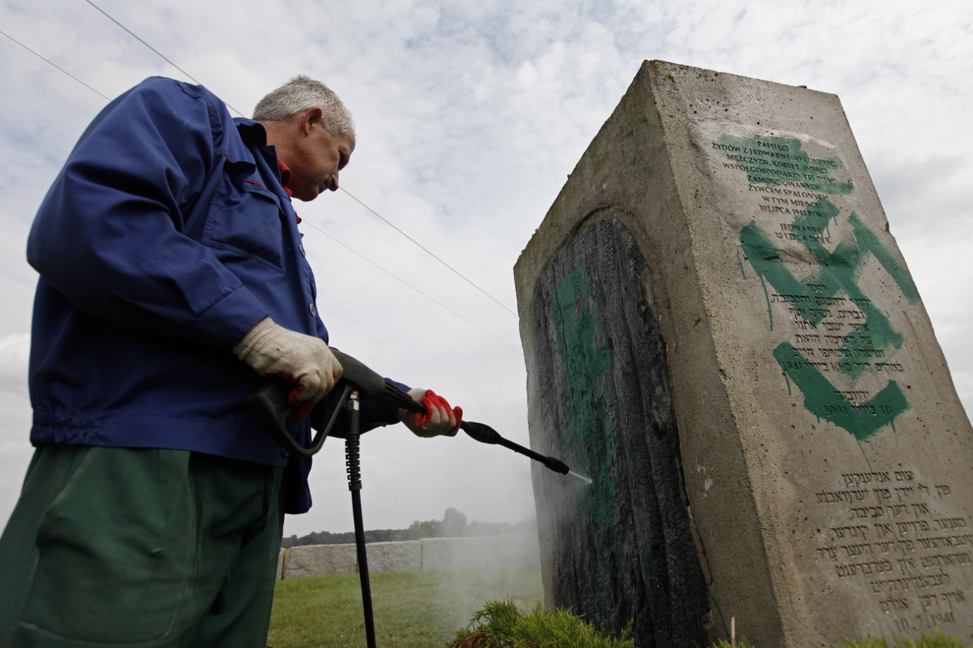 Муниципальный работник очищает оскверненный мемориал в Едвабно